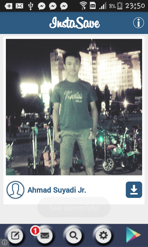 Langkah yang terkahir silahkan sobat buka aplikasi instasave yang telah anda download tadi , secara otomatis foto sobat akan ada di situ , lalu tekan tombol icon download dipojok kanan bawah .
